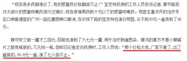 医药网2月23日讯 春节过后,很多常用药价格又上调了,药店难寻十元以下感冒咳嗽药。 过了个年,药价又涨了 2月21日,新快报消息称,新快报记者走访多家药店发现,三九感冒灵颗粒、川贝枇杷膏、杏苏止咳药、沐舒坦、腹可安、六味地黄丸、清肺化痰丸等家庭常用药不同程度上涨,有的涨几元、有的涨了几十元。药店难寻十元以下感冒咳嗽药。 市民李先生说,“小盒的999感冒灵颗粒,春节前还只是八九元一盒,过个年回来,卖到12元-15元了。” “很多药确实贵了,最近两个月一直在涨价。”中山一路采芝林药房销售人员表示,进货价贵了后,零售价也上涨了不少。 其次,涨价的药品虽然很多,但是涨价幅度较大的还是常用药,其中感冒药翻倍涨,有些感冒药涨价超过七八倍。 物价加持着药价一起涨 其实,从去年年初至今,药品提价的消息从未中断。不难发现,药品涨价只缺一个“噱头”。 以北京某小区理发店为例,春节前理发30元,春节后直接上涨5元。询问老板为什么涨价,老板说,现在物价都上涨了。 同理,药企要涨价,可以把“帽子”扣到原料药企头上。原料药企要涨价,可以把“帽子”扣到环保、物价上。 另外,自改革开放后,全国经济开始爆发式增长,然而爆发式增长背后,却是一场贫富拉距战。曾有人坦言,“小米模式”之所以兴起,表明中国还是穷人多。贫富差距太大,就会导致极端消费,完全没有必要的涨价,反而会随市场势头(跟风)一涨再涨。 其次,大部分人和相关媒体有一致的观点,认为药价上涨是市场缺少管制。但是,管制严了药价就会降下来吗? 当然不会,反而是管得越严涨得越快。 原料药背锅 去年7月初,医药经济报一篇《又一原料药涨价50倍!恐波及千亿用药市场》的文章称,日前,某大型药品生产企业采购人员透露:“目前,马来酸氯苯那敏(扑尔敏)原料药报价已从去年底的260~280元/公斤涨至1.5万元/公斤,足足上涨了50倍。” 该文章发布后迅速在全网刷屏,马来酸氯苯那敏(扑尔敏)原料药成为了众媒体点评和批斗对象。谈到药价上涨,原料药必然背锅。 正因如此,刚成立的国家市场总局高度重视,于今年年初,去年年底接连处罚多原料药企。 今年1月2日,市场总局通告称,国内最大的扑尔敏原料药生产企业河南九势和湖南尔康和自2018年以来获得扑尔敏原料药唯一进口代理企业湖南尔康因违反了《中华人民共和国反垄断法》有关规定一同被罚,河南九势被罚155.73万元,湖南尔康被罚1087.41万元。 去年12月6日,市场总局通告称,成都华邑、四川金山、广东台山新宁三家原料药企联合涨价,违反了《中华人民共和国反垄断法》有关规定,没收违法所得和上一年度销售额4%的罚款,总计1283.38万元。 原料药企被处罚了,药价就降下来了吗?以马来酸氯苯那敏(扑尔敏)原料药为例。 据悉,马来酸氯苯那敏原料药制剂有片剂、注射剂,俗名“扑尔敏”,主要用于鼻炎、皮肤黏膜过敏及缓解流泪、打喷嚏、流涕等感冒症状。据总局数据库查询,含“马来酸氯苯那敏”的药品批文有2112个。都是用量非常大的药品,如999感冒灵颗粒、咳特灵胶囊、鼻炎片等。 然而,据新快报报道,节后,感冒药价格还是在上涨,其中小盒的999感冒灵颗粒,春节前还只是八九元一盒,过个年回来,卖到12元-15元了。 有业内人士算了一笔账“无论是原料药、包材还是环保成本的增加,摊到每盒药上,都没多少,不至于让药价翻倍!”“这是有人在浑水摸鱼——反正有原料药和环保背黑锅,我就趁机涨价!” 人工成本也很高 有人认为,政府主导药价,不让涨就好了。但是,现今人工成本越来越高,不让企业涨价挣钱,企业就负担不了员工薪酬。 2018年,除常用药涨价外,就是全国范围内企业裁人,包括京东、滴滴等知名企业,当然,药企也不例外。 2018年11月30日,拜耳大中华区官网公布了一则消息:拜耳意欲加强核心的生命科学业务,同时大力提高生产力和盈利能力。计划退出动物保健业务,出售部分消费者健康品牌和产品线,合计裁员12000人。 2018年9月18日,诺和诺德官方网站发布《转变研发方式的计划》,宣布在中国和丹麦裁员400人。 在此背景下,不少地方为降低失业率,通过返还失业保险鼓励企业不裁员或少裁员。河南出台措施,企业不裁员或少裁员可返还上年度缴纳失业保险费的50%;甘肃兰州:企业不裁员返还50%失业保险费;福建福州:困难企业不裁员可返还五成失业保险费。 虽然部分药有降价,但是全因政府在补贴。