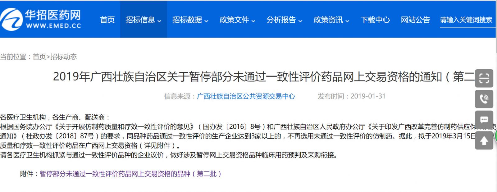 医药网2月2日讯 未过一致性评价,过百药品被暂停挂网,还有大批药企都危险。 ▍未过评,暂停采购 1月31日,广西壮族自治区公共资源交易中心发布《2019年广西壮族自治区关于暂停部分未通过一致性评价药品网上交易资格的通知(第二批)》(以下简称《通知》)。 根据2016年3月5日,国务院办公厅印发的《关于开展仿制药质量和疗效一致性评价的意见(国办发〔2016〕8号)》,同品种药品通过一致性评价的生产企业达到3家以上的,在药品集中采购等方面不再选用未通过一致性评价的品种。 据此,拟于2019年3月15日起暂停以下未通过仿制药质量和疗效一致性评价药品在广西网上交易资格。 请各医疗卫生机构抓紧与通过一致性评价品种的企业议价,做好涉及暂停网上交易资格品种临床用药预判及采购衔接。 ▍多药企难幸免 从第二批名单可以看出,被暂停网上交易资格的药品主要是阿莫西林胶囊和恩替卡韦分散片。 其中,除生产恩替卡韦分散片的两家药企,海南中和药业、山东鲁抗医药外,其余涉及的几十家药企被暂停采购的均是阿莫西林胶囊。 不少过一致性评价药企达3家和3家以上的产品都是生产企业众多、市场用量大的品种。 拿阿莫西林胶囊来说,据赛柏蓝查询国家药监局数据库,药品批文达234条,涉及一批知名药企,如康美、神威、葵花、广药白云山、华北制药、哈药等。恩替卡韦分散片的药品批文也达到10家。 据赛柏蓝统计,截至目前,共有瑞舒伐他汀钙片、蒙脱石散、盐酸二甲双胍缓释片等10个品规通过企业达到3家或3家以上,这也意味着这些品规未过一致性评价的药企将先行退出市场。 (制图:赛柏蓝) 可以说,随着多省落地过一致性评价药企达三家,不再采购未过一致性评价药企品种的政策,众多药企的相应品规将被暂停采购。 相比于以往数次暂停采购的通知,广西此次的通知,涉及的药企最多。据赛柏蓝统计,目前已经有5省,对未过一致性评价的药企产品说“不”。 ▍5省已行动 江苏 2018年11月22日,江苏省公共资源交易中心发布通知,9家药企的9个品种因同品种药品过一致性评价达3家,而被暂停采购。 江西 2018年8月11日、8月17日、11月5日,江西省医药采购服务平台先后发布通告,共8家药企的9个药品由于同品种药品过一致性评价达3家,未通过一致性评价,被暂停采购 。 2019年1月25日,江西省再发通知,成都恒瑞制药、正大天晴等15家药企的盐酸二甲双胍缓释片以及浙江亚太药业股份有限公司和昆明贝克诺顿制药有限公司的阿莫西林胶囊都因未过一致性评价而暂停挂网。 黑龙江 2018年10月18日,黑龙江省卫健委发布《关于暂停未通过仿制药质量和疗效一致性评价企业药品(第一批)网上交易资格的公告》,27个药品被暂停采购资格,涉及23家药企。 广西 2018年11月15日,广西药械集中采购网发布通知,9个药品被暂停采购。 湖北 2018年10月26日,湖北省公立医院药品(耗材)供应保障综合管理网发布《关于调整未通过一致性评价品种挂网信息的通知》,5个未通过一致性评价品种被暂停挂网,涉及10家生产企业的14个药品。 在国家组织药品集中采购的刺激下,2019年的一致性评价工作将进一步提速,届时,难以赶上“班车”的药企将难免出局的命运。