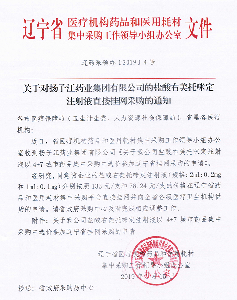 对扬子江药业盐酸右美托咪定注射液直接挂网采购