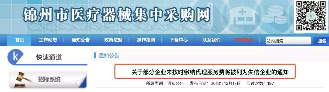 医药网12月19日讯 中标医械企业的招标代理服务费迟迟收不上来,招标代理公司不忍了:一而再再而三的谈都不行,拉黑算了。 12月17日,辽宁省锦州市医疗器械集中采购网发布《关于部分企业未按时缴纳代理服务费将被列为失信企业的通知》,对拖欠招标代理服务费的医械企业不忍了,再不按时给钱,就上报卫计委,做拉黑处理。 这份署名为“某某国际招标有限责任公司锦州分公司”的通知里提到,锦州市医用耗材及检验试剂网上采购工作自2016年10月18日至今一直稳定有序进行,但目前仍有部分企业拖欠代理服务费未交。 很明显,这家公司是锦州市的耗材招标第三方代理机构,负责锦州市的医用耗材的招标代理工作。 对此情况,上述招标公司称,针对未按时缴纳代理服务费、且经多次沟通后仍未缴纳代理服务费的企业,将被列为失信企业黑名单。 “某某招标锦州分公司”称,将把失信数据上报锦州市卫计委及省相关部门备案。并提醒“如果被纳入到失信企业库,会影响到企业在其他地区的产品销售”。最后提请相关企业慎重,出现差结果要自负。 临近年底,各行各业都面临着回款压力。款回不来就意味着今年业绩将差于预期,业绩差就没法上交一个完美的年终报告,没有好的年终报告哪来丰厚的年终奖。 连锁反应层层传递,压的大家都喘不过气。 招标代理公司没办法,一再拖欠让人吃不消,咋办?给曾经的中标企业一个选择方案:要么交钱,要么被拉黑。反正拉黑之后会影响“企业在其他地区的产品销售”,中标企业两害相权取其轻,自会衡量是几万块的代理服务费重要还是产品再其他地区的销售重要。再说,有的代理服务费甚至只有几十元,不交的原因可能只有一个:钱太少,企业容易健忘。 事实上,招标代理服务收费可谓由来已久。 曾有一段时间,行业讨论关于代理服务费由招标人支付还是投标人支付的讨论。但目前普遍情况是,一些招标人根据相关文件中“另有约定的,从其约定”的规定,在与招标代理机构签订招标代理合同时,利用自己在市场中的强势地位,在代理合同中“约定”招标代理服务费由中标人支付。 在医械行业,这个“支付人”就是众多在招投标中中标的医械公司了。 具体服务费多少,根据规定指导来定,其中一个依据是中标产品金额量的多少。一般情况下,招标代理公司会按月收取服务费。辽宁省抚顺市的一家医用耗材招标代理企业发布的7月份代理服务费清单显示,在其所代理的300多家企业中,代理服务费的金额从几十元到近十万元不等,当月的代理服务费总计金额约96万元。 2018年,锦州市医疗器械集中采购网发布的“通知公告”里,全部是收取代理服务费的通知。即使是这样,仍有企业不交代理服务费,最终,拉黑的通知来了。 在国家进一步构建和完善社会信用体系的当下,被纳入到失信库的企业,因失信行为带来的负面影响是一系列的,比如挂网品种受限、已挂网产品撤销;对上市公司而言,更是会影响其股价表现等。而锦州的这份通知中提到“会影响到企业在其他地区的产品销售”是最重要的事项之一,也可以看成是招标代理公司拿出的“置换筹码”。 这个“筹码”也比较给力。 辽宁省是目前高值耗材“14省际联盟”成员之一,14省际联盟不仅共享价格产品信息等数据,还共享企业信息,尤其是关于失信行为,在一省出现后,会迅速蔓延至其他省份,产品将面临信用降级、暂停或撤销挂网的境地。另外,前段时间已有媒体报道,辽宁和山东加入“京津冀”耗材采购联盟,与“14省际联盟”相同的是,“京津冀”联盟也将共享企业的失信行为。 如此,确实会出现“影响到企业在其他地区产品销售“的情况。 当然,“某某招标公司”只是行业里众多招标代理公司的一个缩影,他们也面临着累计了许久的代理服务费迟迟收不上来的情况。不过,希望“不按时交费就拉黑”的通知不要成为行业“缩影”,让它成为一个特例好了。