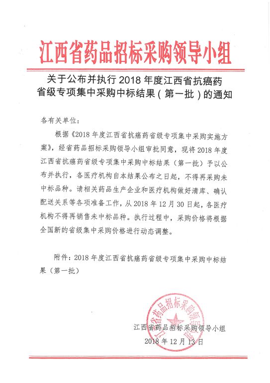 附件:2018年度江西省抗癌药省级专项集中采购中标结果(第一批)