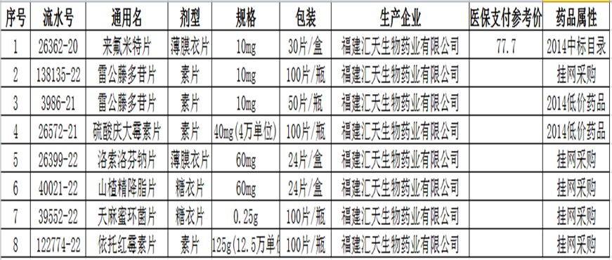 医药网12月6日讯 各相关医疗机构: 因福建省食药监局发回福建汇天生物药业有限公司的片剂GMP证书(证书编号:FJ20140017),报省药政联席会议研究,经该企业承诺:恢复片剂网采后对安徽省内供货为再次核发GMP证书后生产的药品,并主动接受社会监督。现恢复该企业所有片剂在我省医药集中采购平台的网上采购资格,具体涉及品规如下。 2018年12月6日