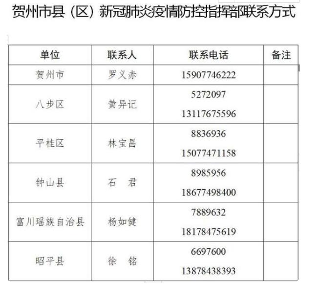 为做好新冠肺炎疫情防控工作,请2021年6月11日乘坐动车D2956在贺州站上车、下车的同车厢(8号车厢)人员,第一时间主动与辖区新冠肺炎疫情防控指挥部联系(具体联系方式见图片),并与共同居住的人员先行居家隔离,非必要不外出,主动配合当地新冠肺炎疫情指挥部接受流行病学调查及其他防控措施。如不及时如实报告,造成疫情扩散蔓延的,将承担相应法律责任。