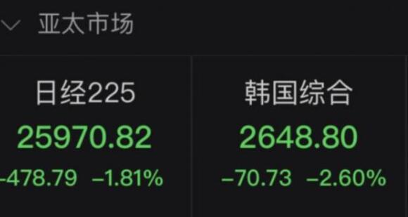 截至发稿,韩国综合指数跌2.60%;日经225指数跌1.81%。