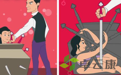 这是一个比较传统的魔术,我们可以看到魔术师将装着助手的木箱插满锋利的剑,助手却毫发未损。这是利用了观众轻信的思维,以为箱子内部没有空间,其实插剑的方向和顺序早已经设计好,剩下的空间,足够容下助理柔软的身体。